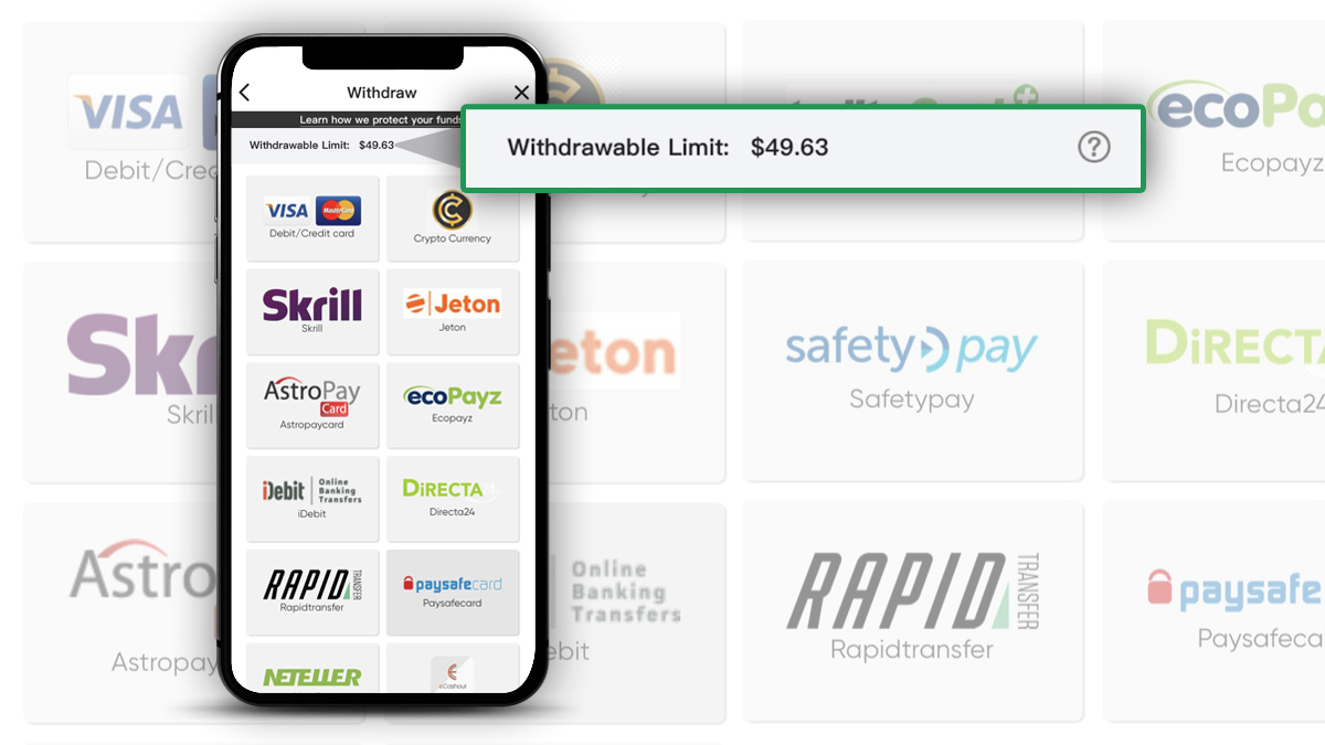 The minimum withdrawal amount for most payment methods is $20. However, some methods differ. For example, ecoPayz is $30.